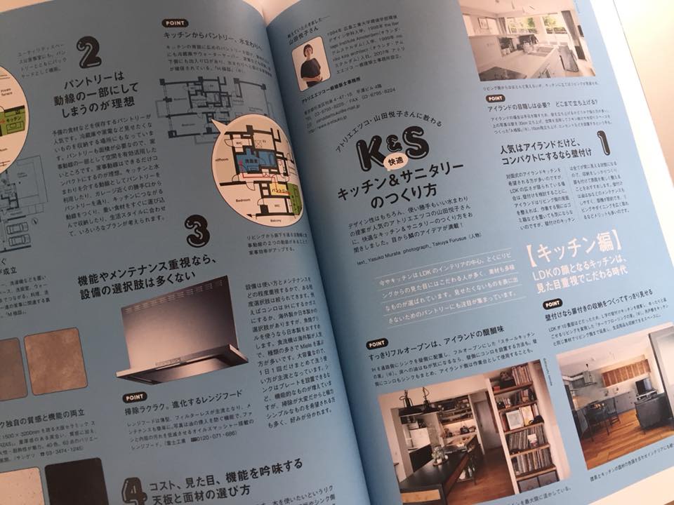 「アトリエエツコ 山田悦子に教わるキッチン&サニタリーの作り方」と言う見開き4ページに渡って、弊社の水回りの動線から材料、設備機器まで特集頂きました。