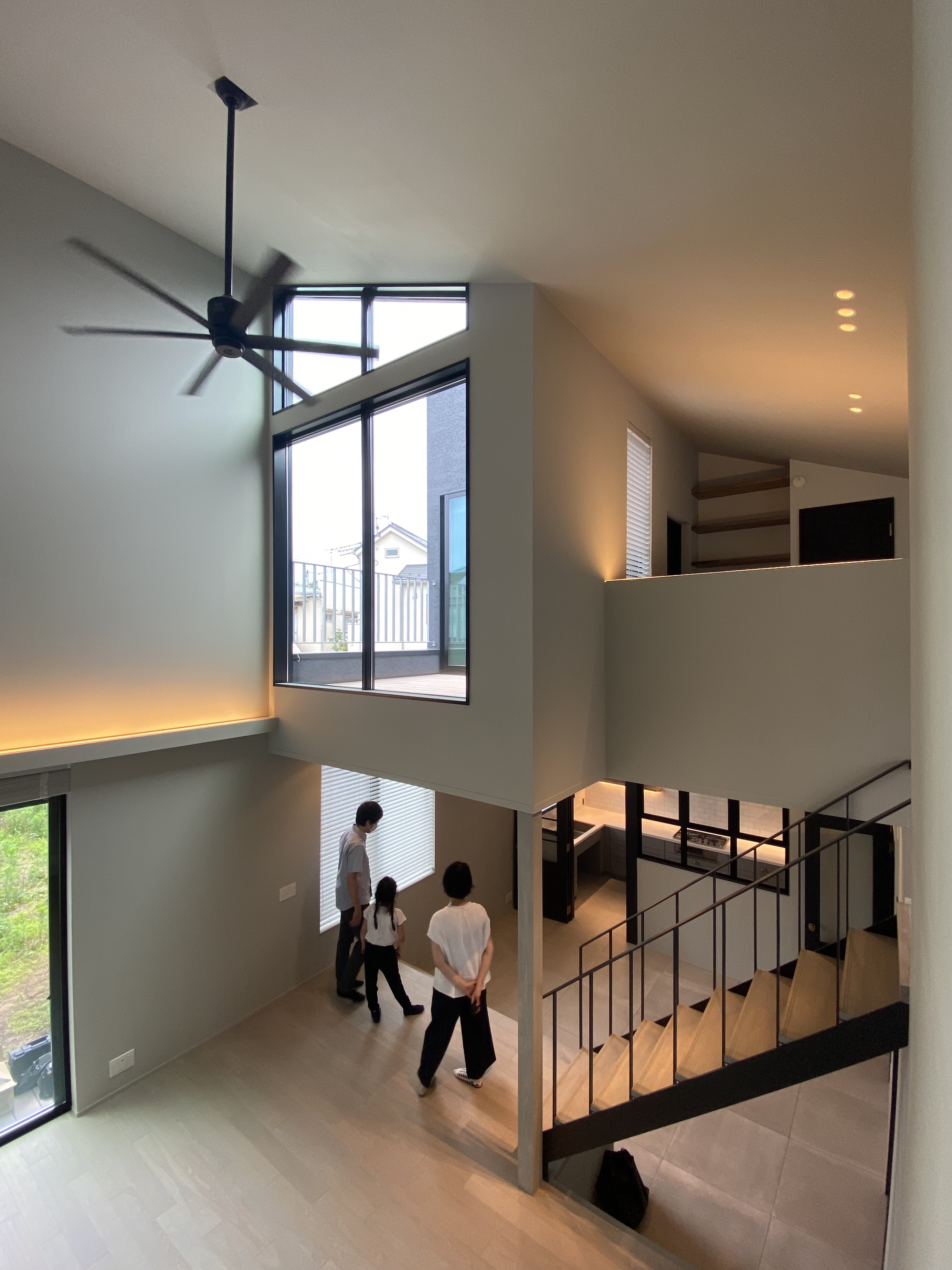 住宅街の旗竿敷地の物件ですが、スキップフロアーで床レベルを変えたり、天井高さを高くする事で、室内は伸びやかで明るい空間になりました。