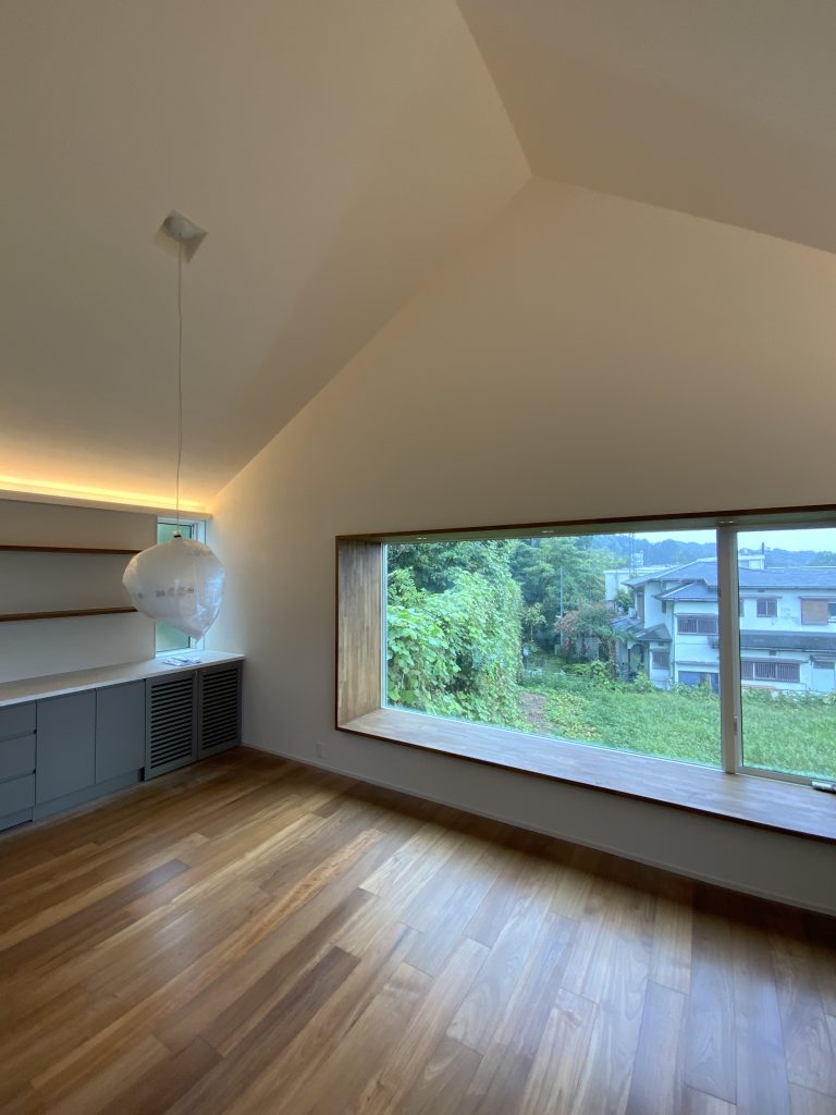 裏側に広がる緑地帯を望むリビングからの大窓は出窓兼 ベンチになっていて、ゆっくりと佇みながら時を過ごすには最高の場所になっています。珪藻土で仕上がった天井が高いLDKも想像以上の広がりが出ていて、とても素敵な空間となっています。