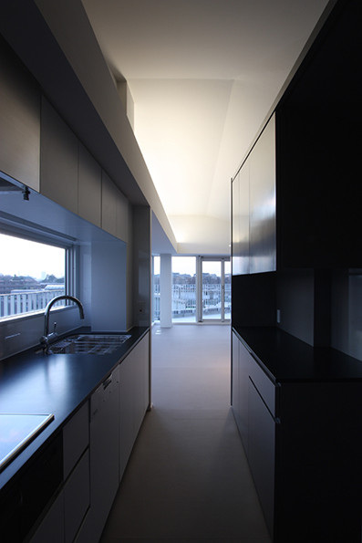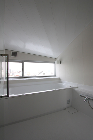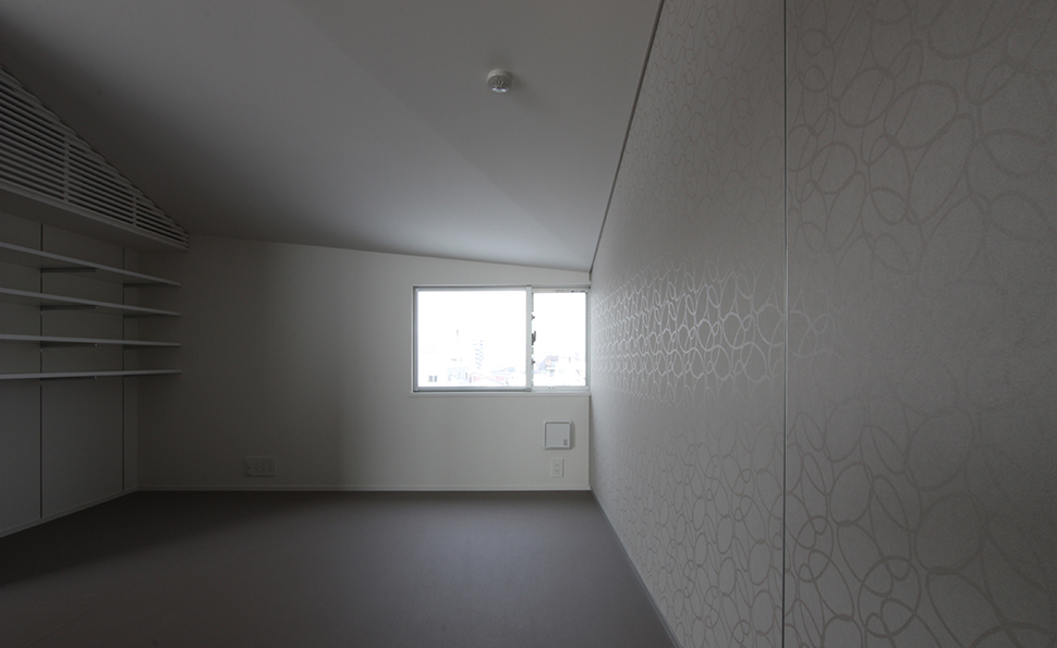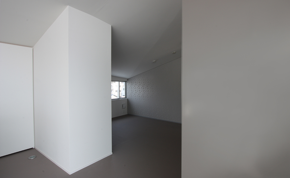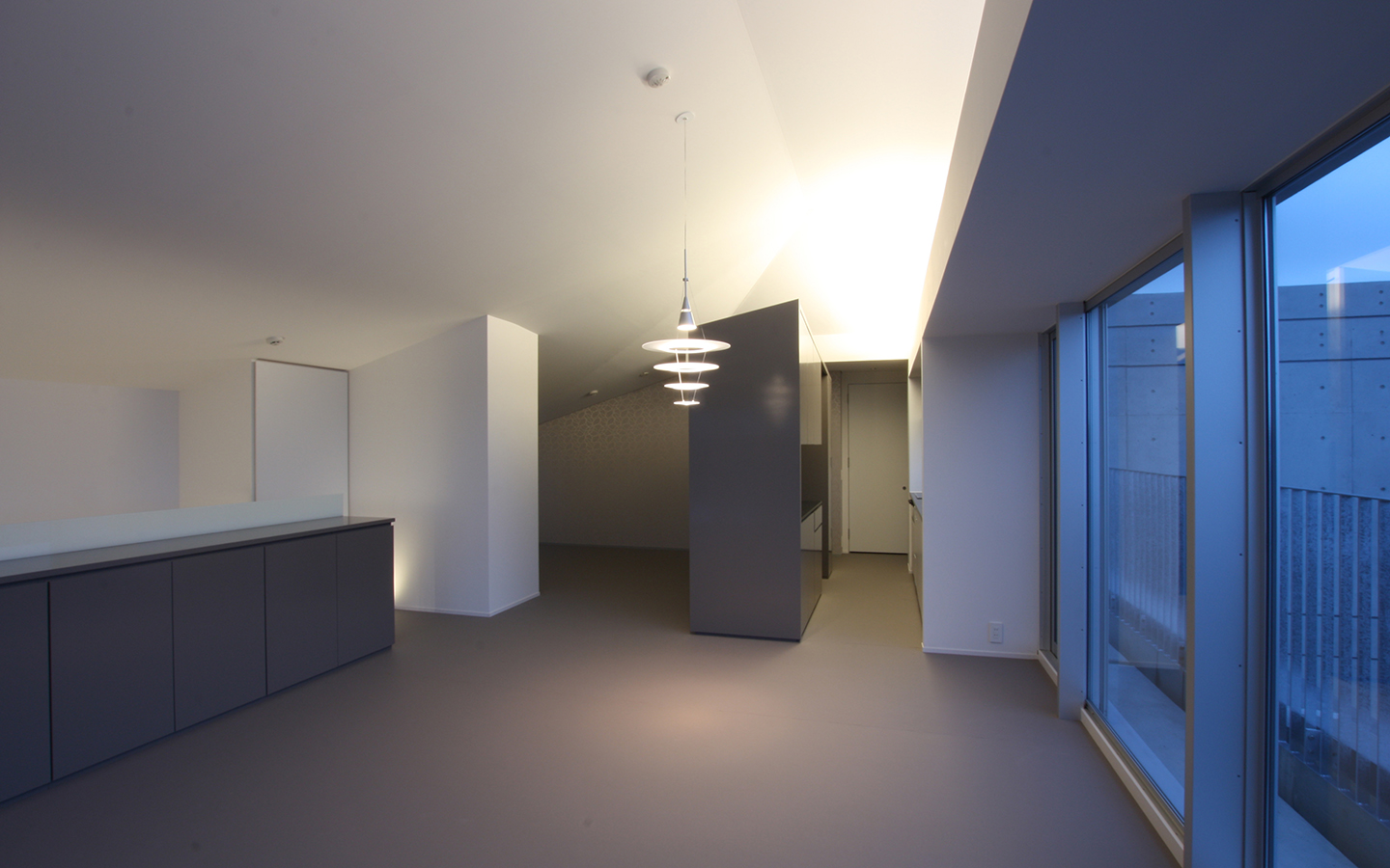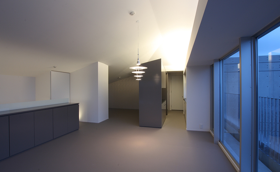 コーポラティブハウス内のインテリア設計 ver.02 北側斜線、日影規制等から生まれた大きな傾斜屋根にすっぽりと包まれた家。 天井高の高い・低いによって、開放的な空間(リビング・ダイニング)と落ち着いたプライベートな空間(個室・浴室)の差異を出している。 家族がどこにいても、この大きな屋根で繋がっていられる家である。