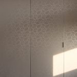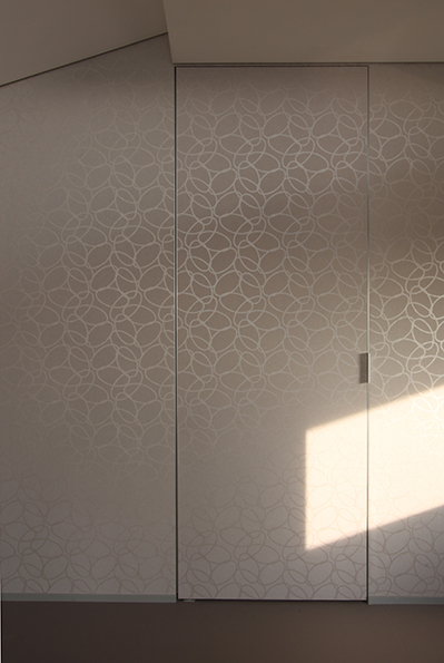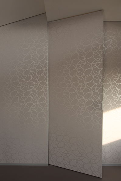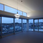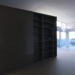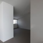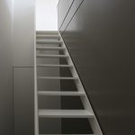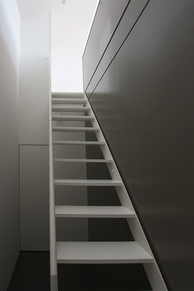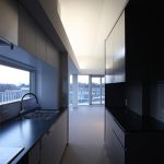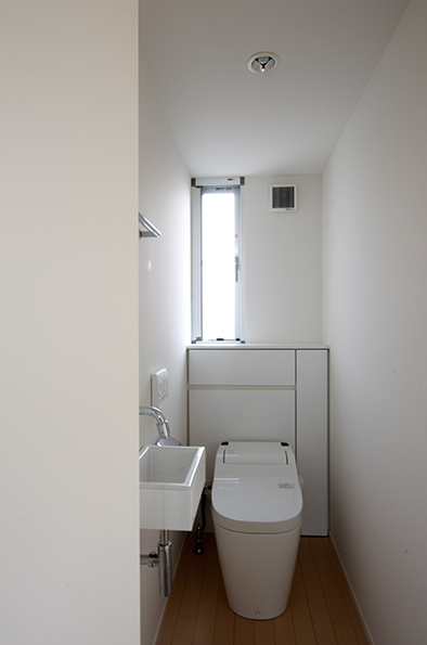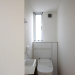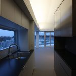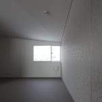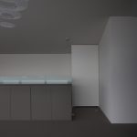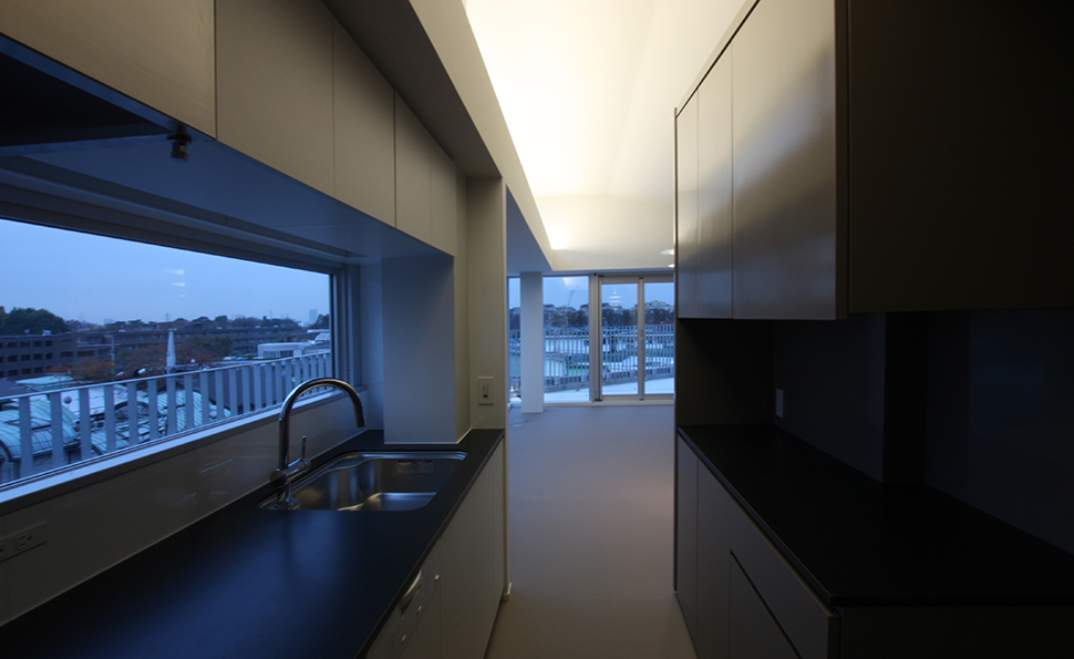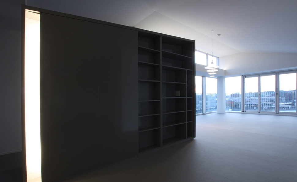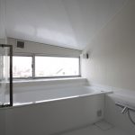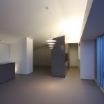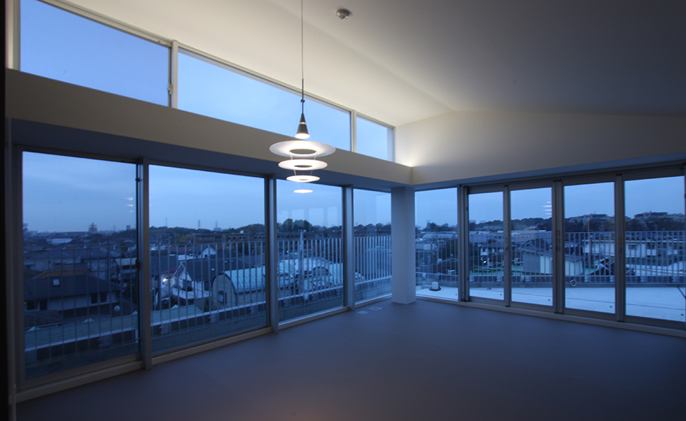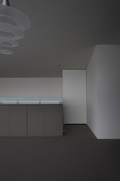 コーポラティブハウス内のインテリア設計 ver.02 北側斜線、日影規制等から生まれた大きな傾斜屋根にすっぽりと包まれた家。 天井高の高い・低いによって、開放的な空間(リビング・ダイニング)と落ち着いたプライベートな空間(個室・浴室)の差異を出している。 家族がどこにいても、この大きな屋根で繋がっていられる家である。