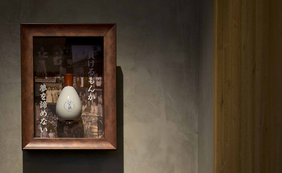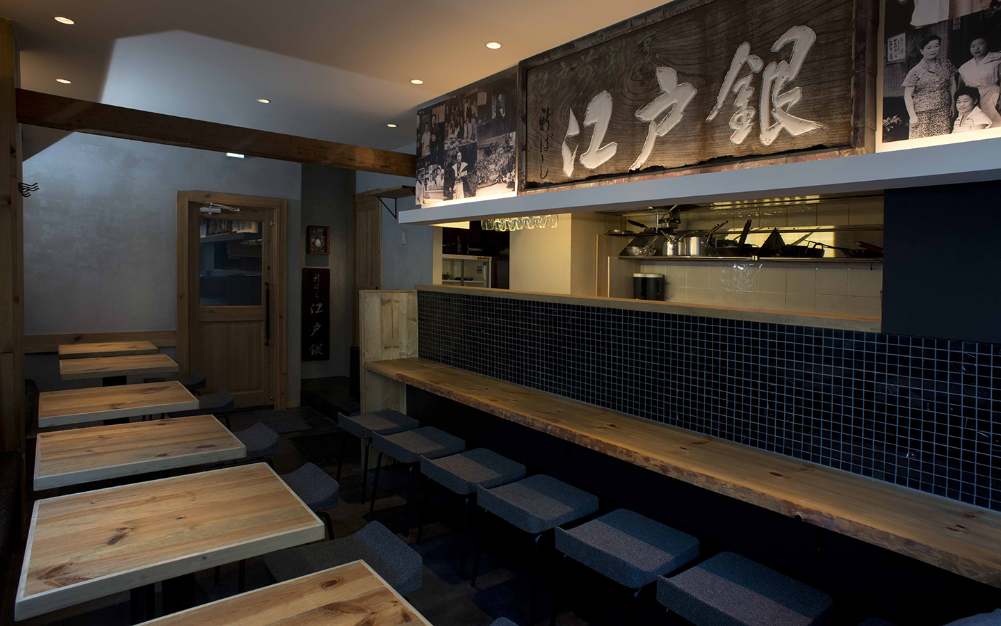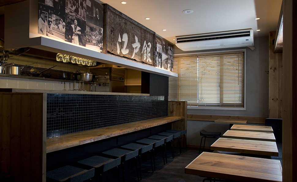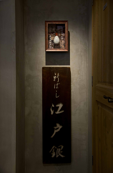 初代銀次郎が明治41年に新橋銀座口に魚屋から始めた「江戸銀」 2代目鎌田久江が戦後日本初の女性ふぐ調理師の免許を取得したり、「新ばし江戸銀」を舞台とする映画が作られるなど注目を浴びました。 この映画が大ヒットし、「江戸銀」という粋な寿司屋の話が流行ったと言われています。当主は4代目としてこの「新ばし江戸銀」の名を新たに「江戸前ビストロ EDOGIN」として新しい日本のフレンチを提供する場として再開店。 この百余年の歴史に支えられたEDOGINの歴史が感じられる店舗デザインとなっています。