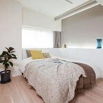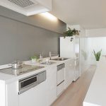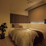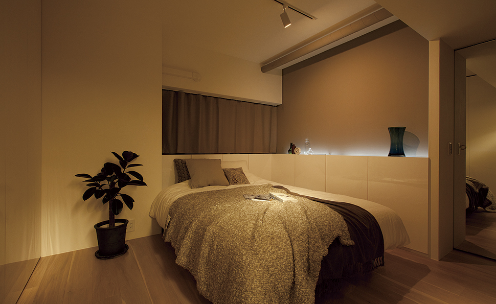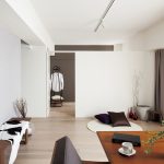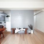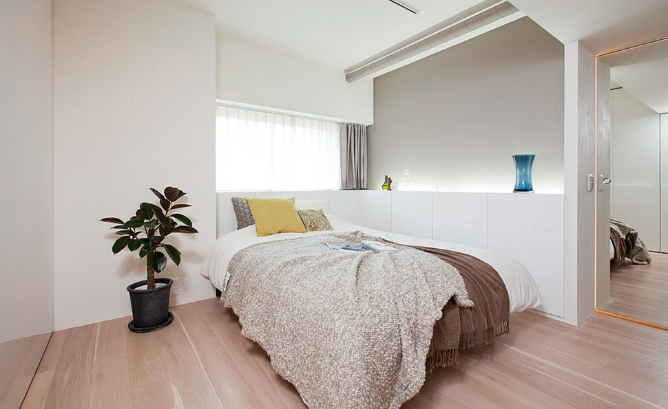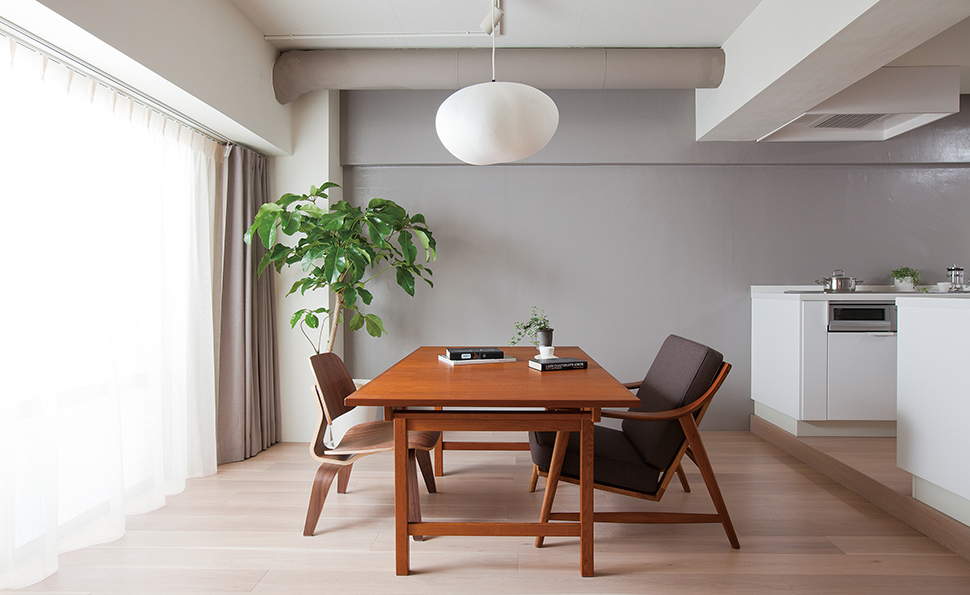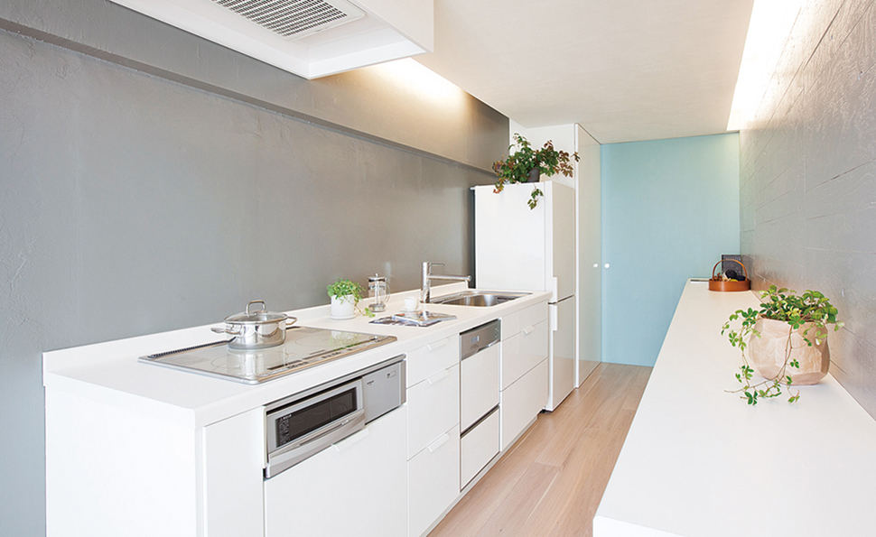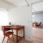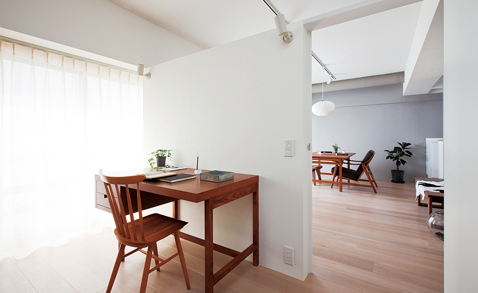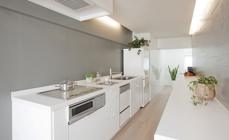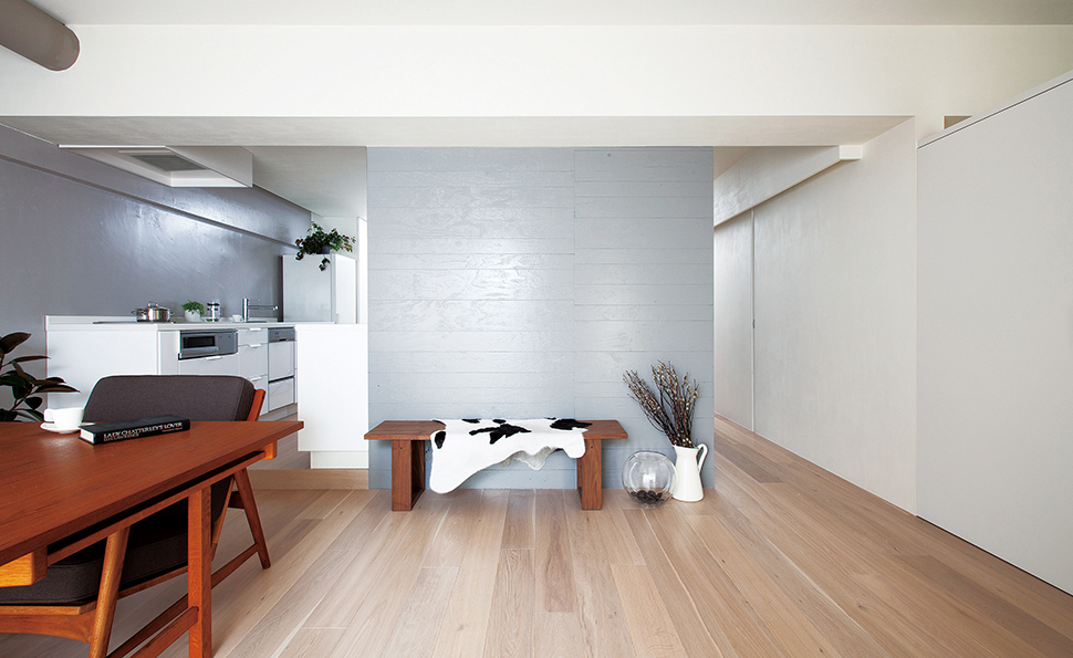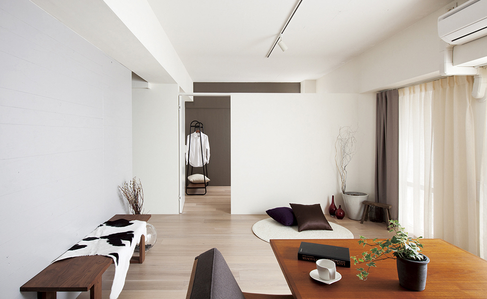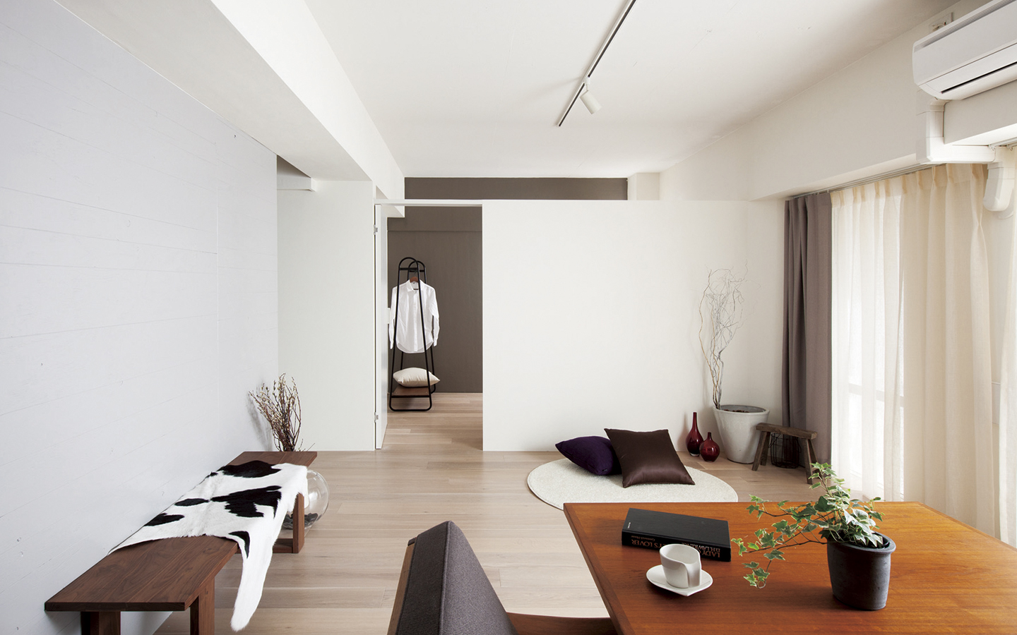 マンションの1住戸のリノベーション。 廊下側個室と中央に位置していた窓のないダイニングキッチンへの通風・彩光を考慮し、平面計画をしている。 また、リビングダイニング横の個室の壁を天井まで設置しない事で、リビングダイニングが広く見える視覚的効果を期待している。 冷暖房効率を考慮し、壁の一部が動く事でそれぞれの部屋を区切る事もできる。