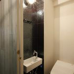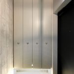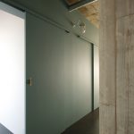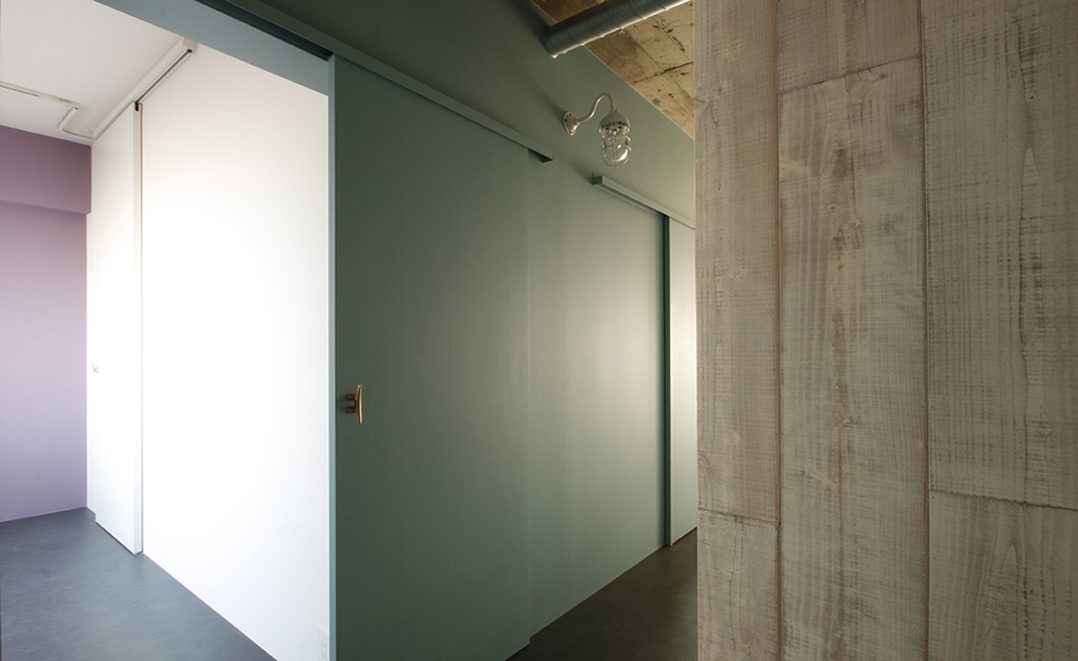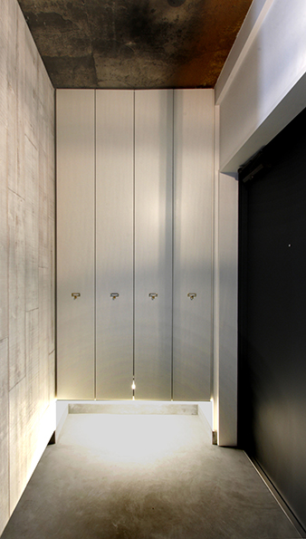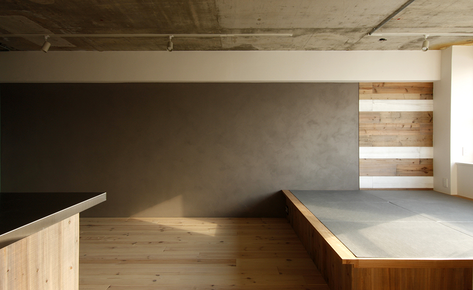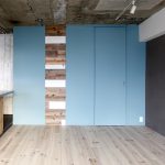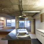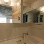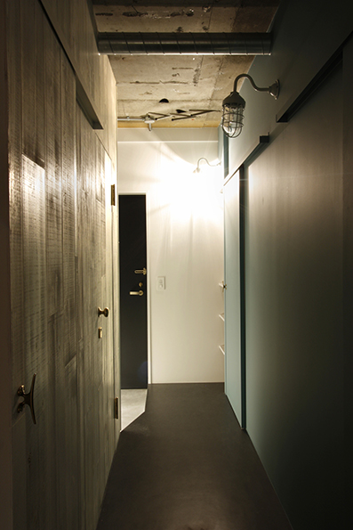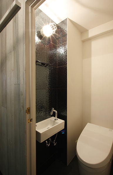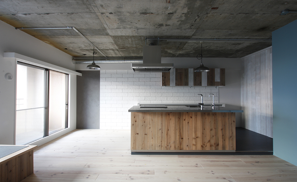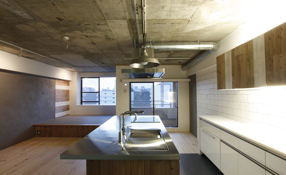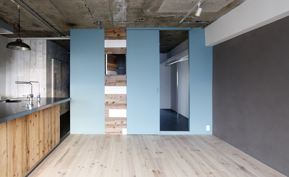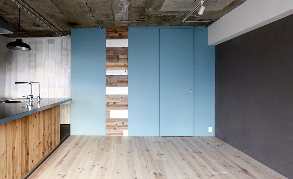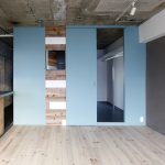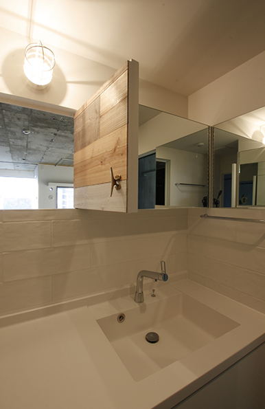 マンションリノベーション この住戸はバルコニー側は見下ろせば公園の緑が見え、 前方には都心の喧騒がダイナミックに見えるマンションの一住戸。 このダイナミックな眺望をどの場所にいても楽しめるように、平面計画をしている。 眺望、風通しを考えて、扉を開ければ、通常薄暗い洗面所からは眺望がみえ、 寝室につながるウォーキングクローゼットはリビング側から光や風が通るようになっている。