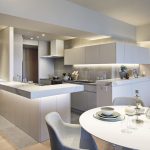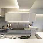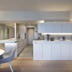 • 玄関ホールから延長されたL型カウンターと一体化するキッチン 背面の吊戸もL型