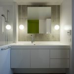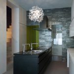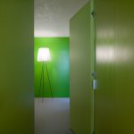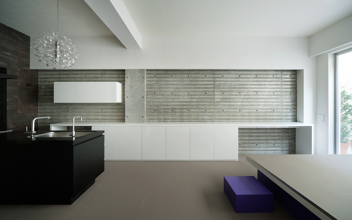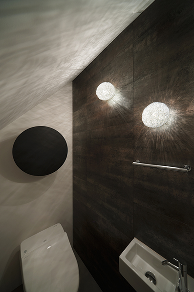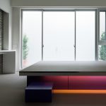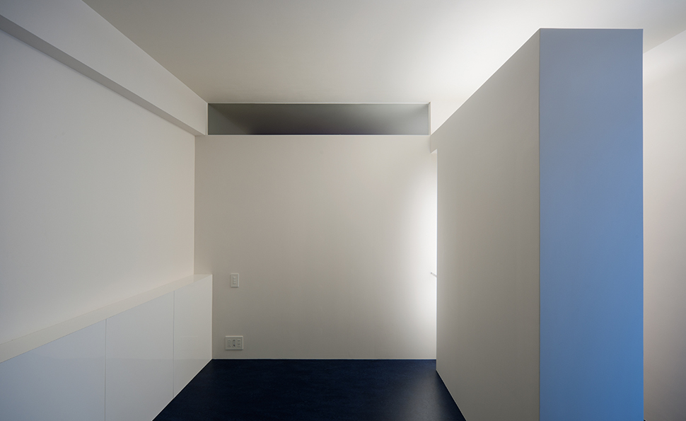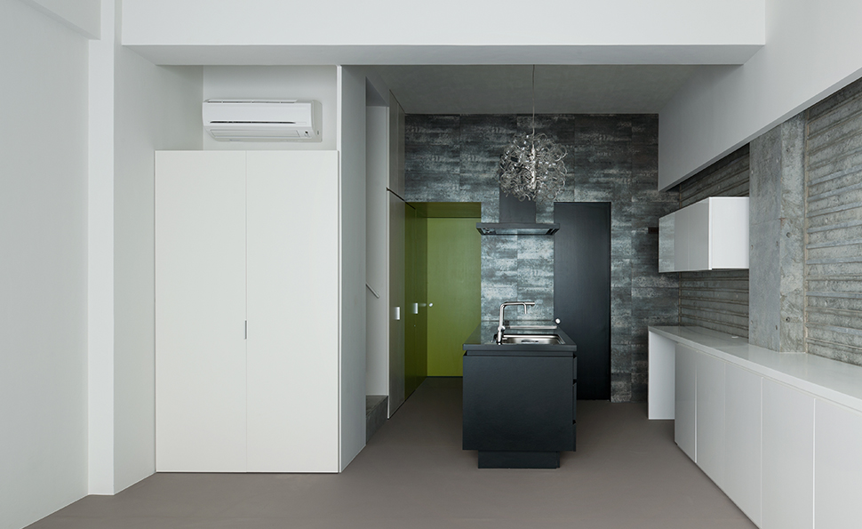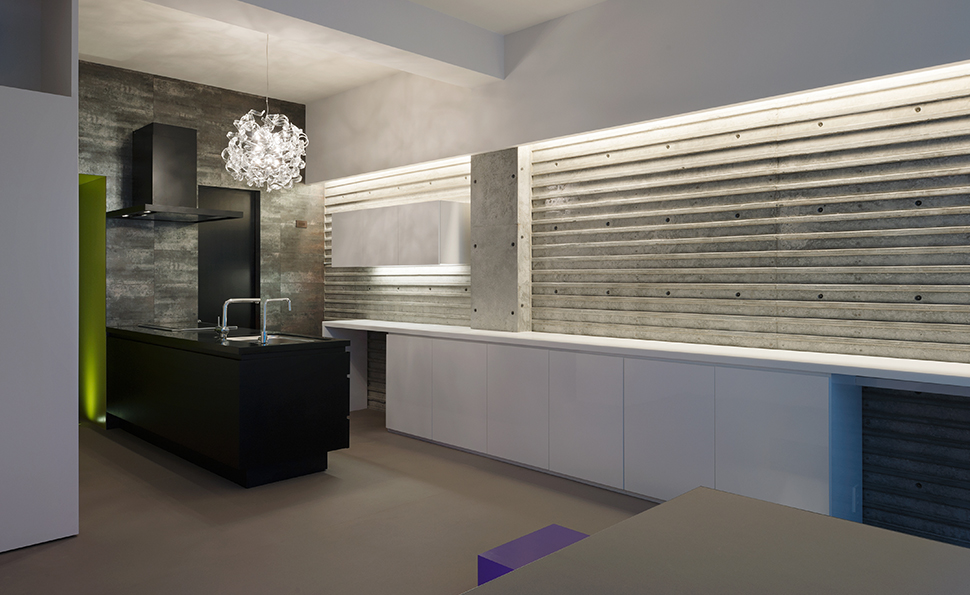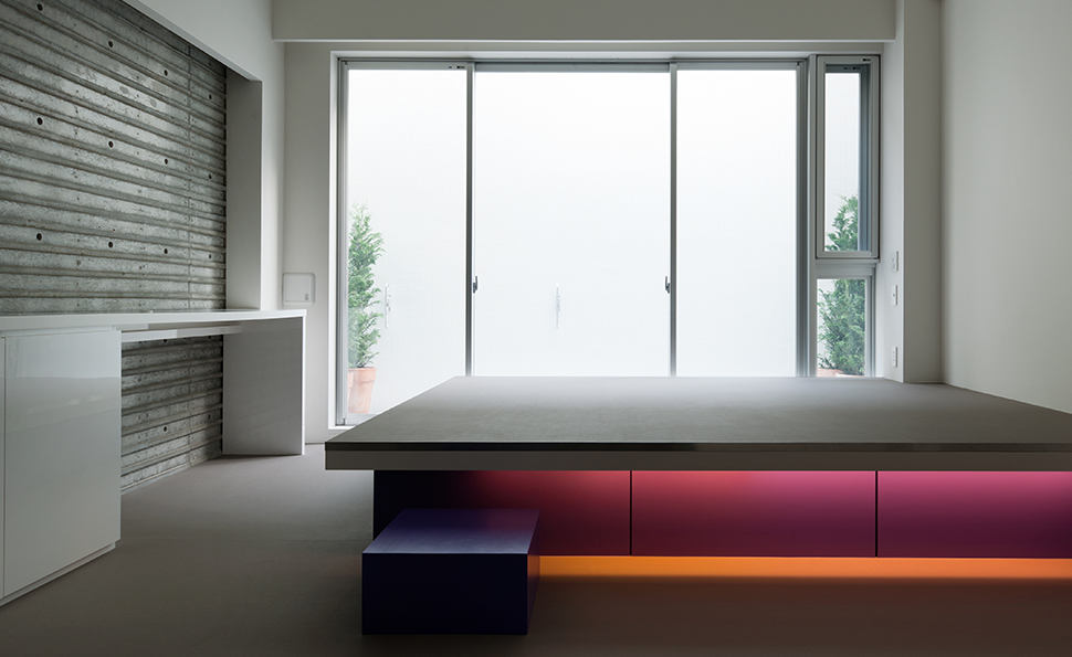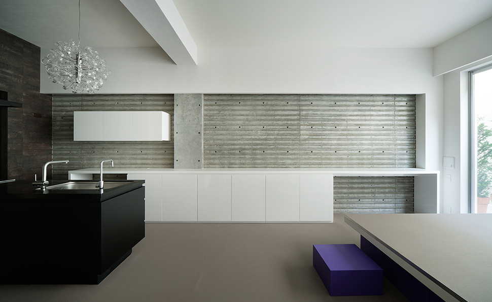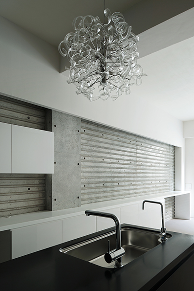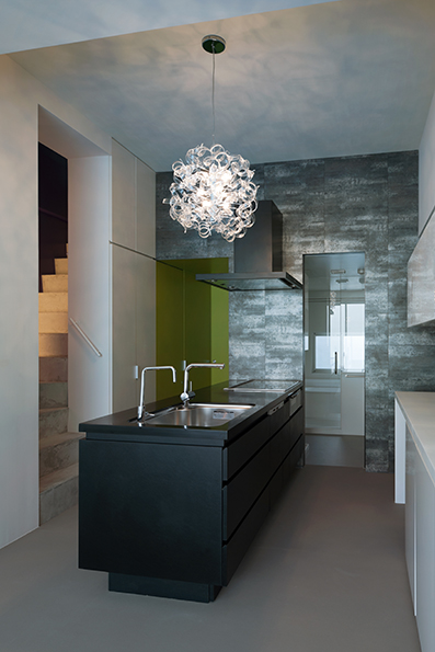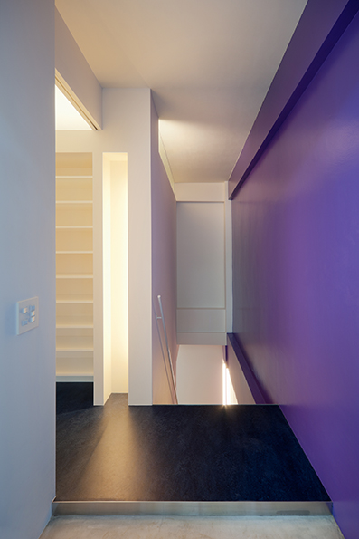 コーポラティブハウスの一住戸 玄関と寝室以外の部屋は全て地下にある住宅。 LDKは約3mある天井高と前面からのテラスによって、開放的で明るく風通りもよい地下住宅となっている。 施主の要望で各部屋のテーマカラーを付けている。 照明メーカー勤務の施主が支給された個性的な照明や真っ黒なキッチンが住宅全体のアクセントとなっている。