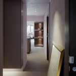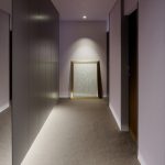 • 玄関ホール 壁面収納の下部の間接照明で浮遊感を演出 壁天井はViolet Dust色を採用
