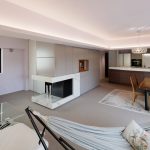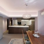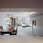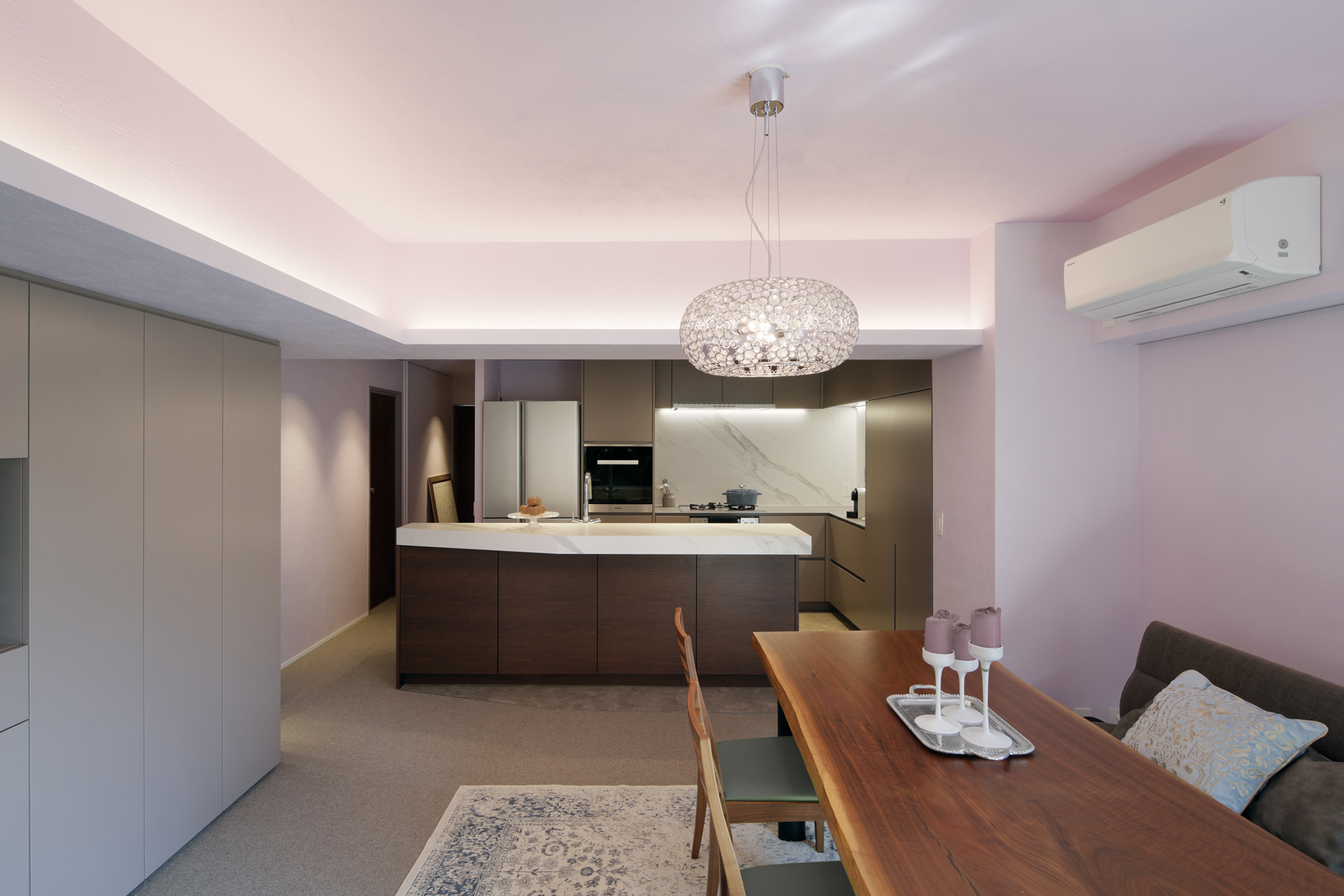 • キッチンからLDを見る 壁天井はViolet Dust色を採用 陰影で塗料の骨材が見える